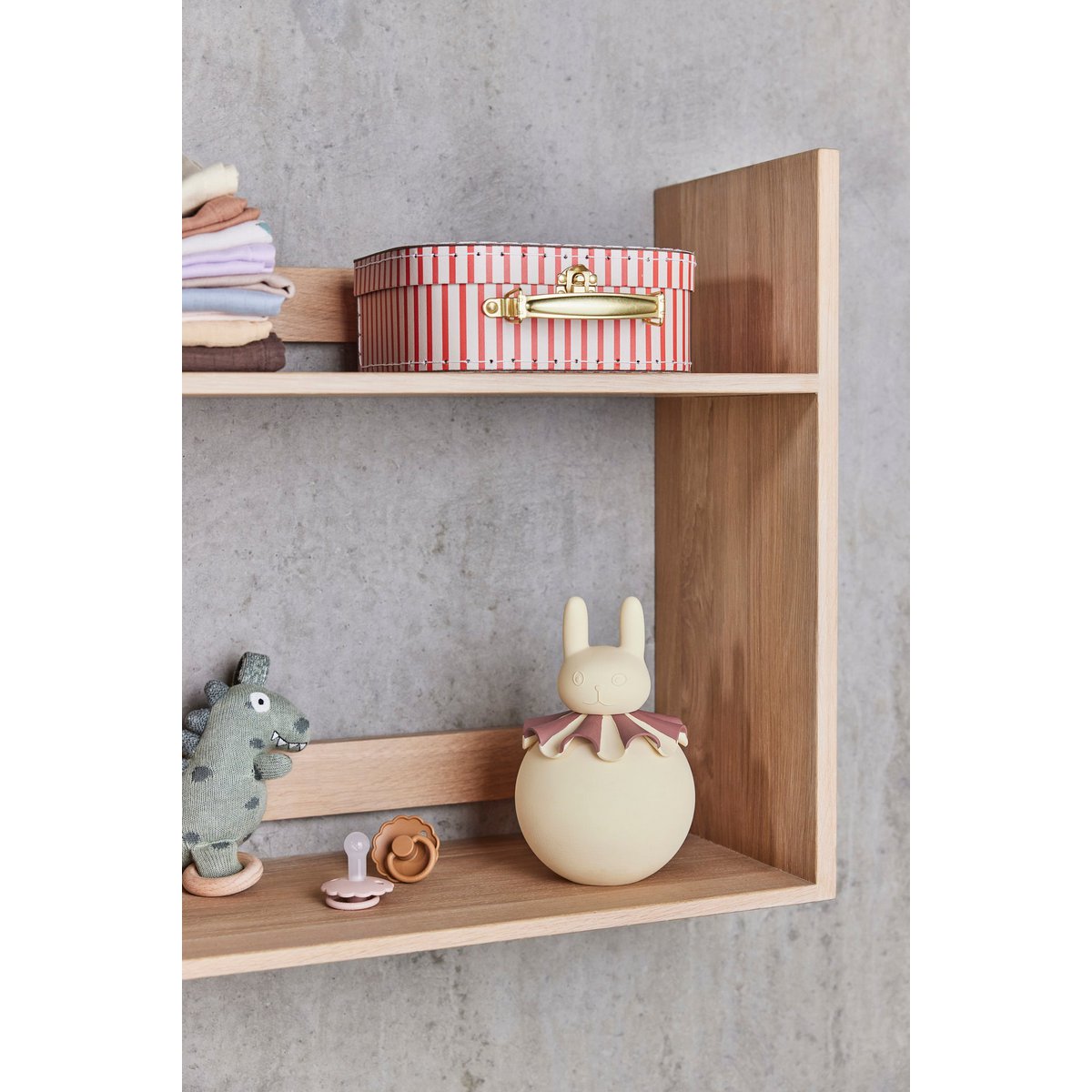 Mecanismul simplu și intuitiv se activează printr-o mișcare naturală – trăgând ușor de inelul din lemn, melodia începe să se deruleze, umplând camera cu note liniștitoare. Prezența prietenoasă a lui Theo Dino deasupra pătuțului aduce zâmbete și creează un sentiment de siguranță și familiaritate pentru copilul tău.