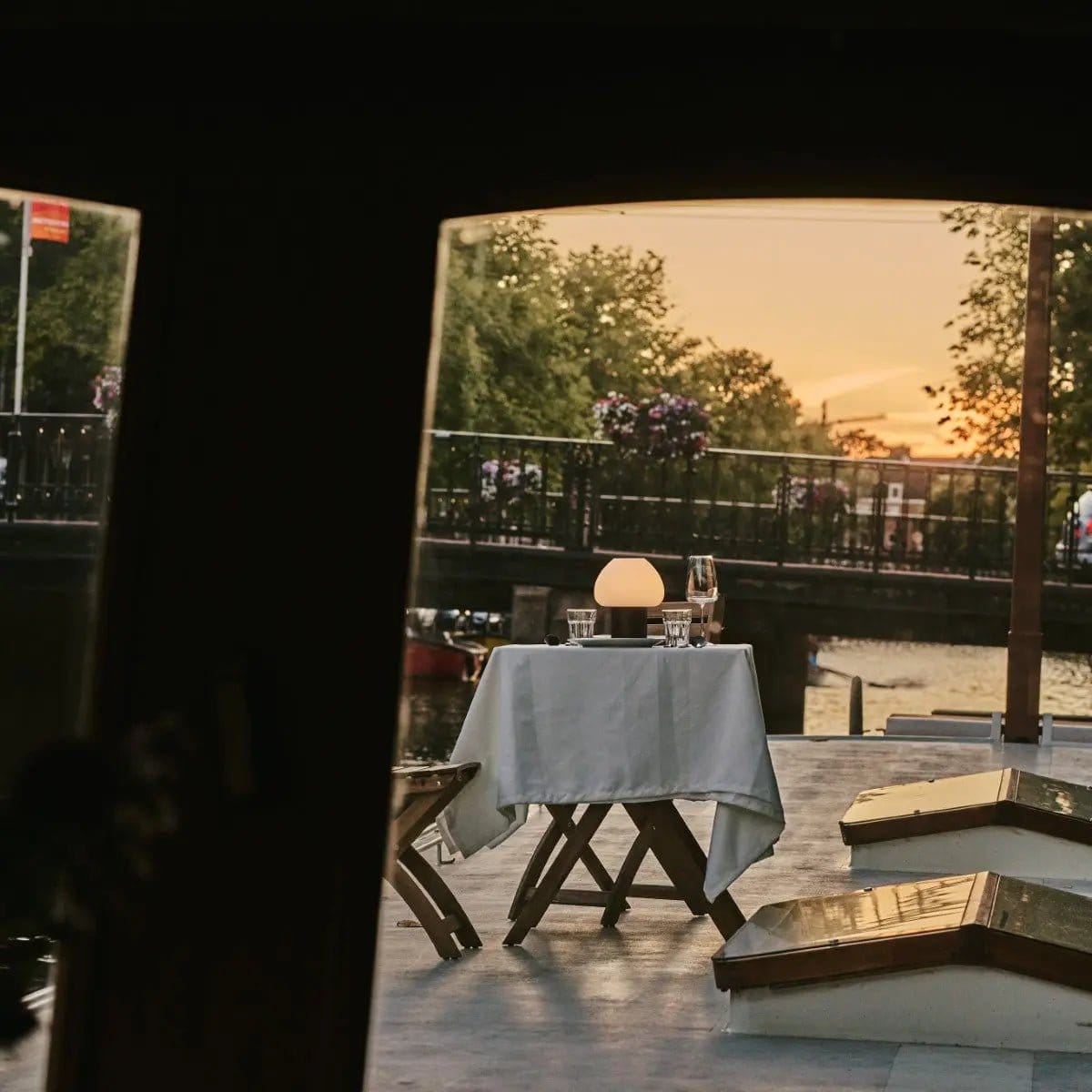 Lemn închis și sticlă mată într-o formă compactă. O lampă wireless care luminează blând, fără să orbească. Baterie de 5000 mAh cu autonomie până la 100 ore, trei tonuri de lumină prin atingere. Simplă și discretă.