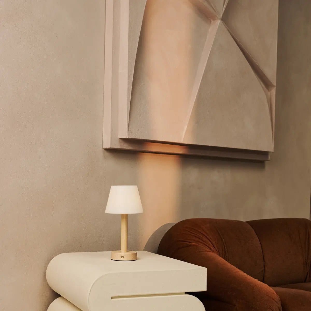 Zoë combină o bază din lemn cu un abajur cilindric din polietilenă. Wireless, reîncărcabilă prin USB-C. O poți muta oriunde fără să te gândești la prize sau cabluri.