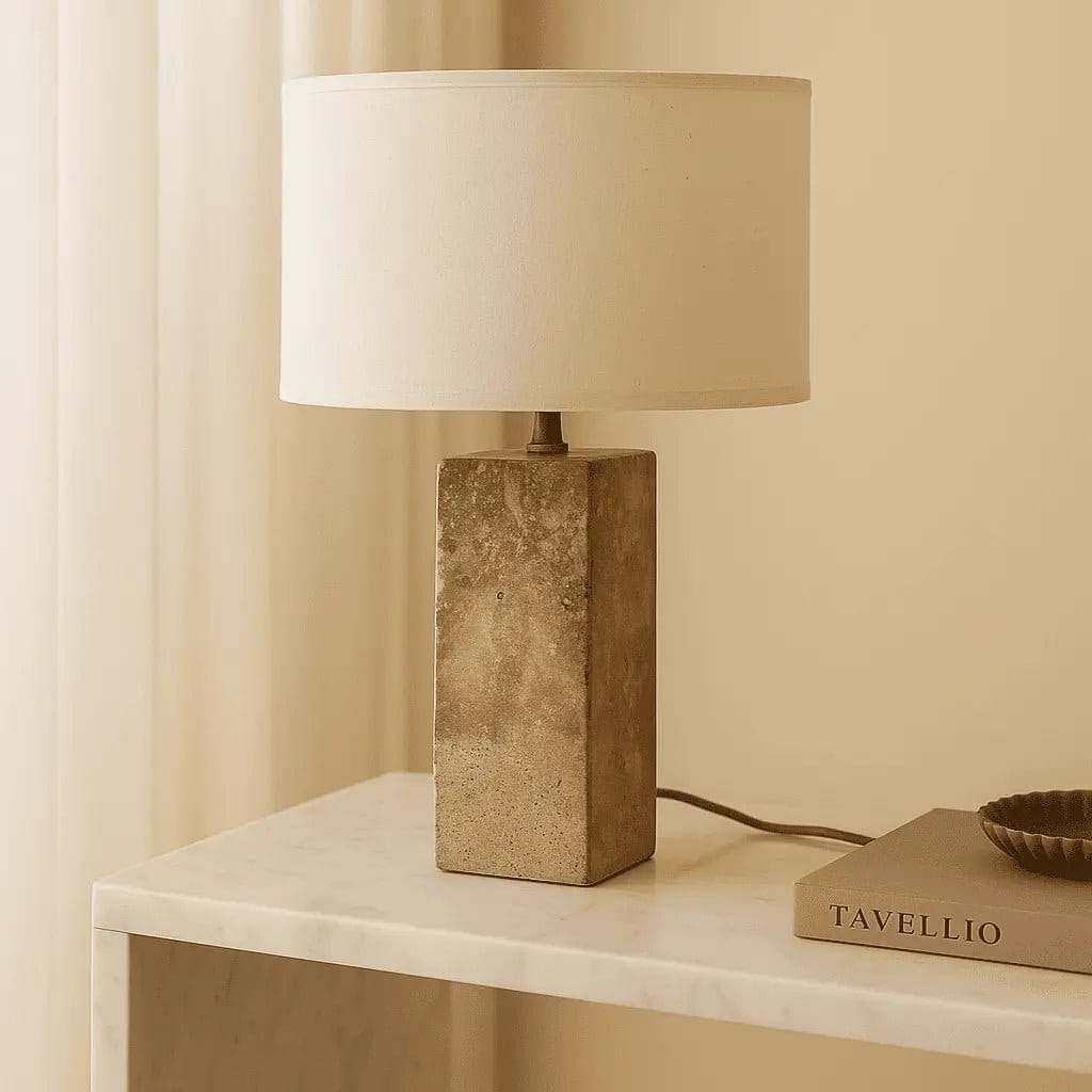 Travertin rectangular și bumbac natural. O lampă cu prezență discretă și caracter puternic. Bază masivă din piatră cu texturi unice, abajur care filtrează lumina uniform. Cablu de 2 metri cu comutator.