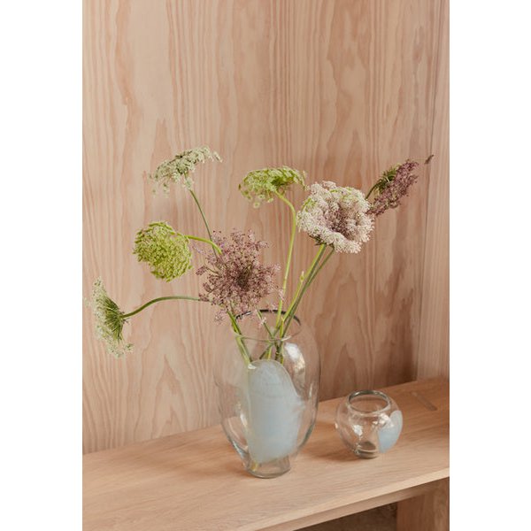 O vază delicată din sticlă colorată, cu detalii jucăușe și forme rotunjite care aduce personalitate și farmec oricărui colț al casei.